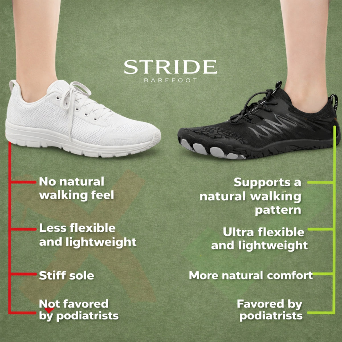 With Stride Barefoot shoes, you're choosing comfort, healthy feet, and a natural walking experience. Our minimalist design gives you the feeling of walking barefoot while still providing protection and support.